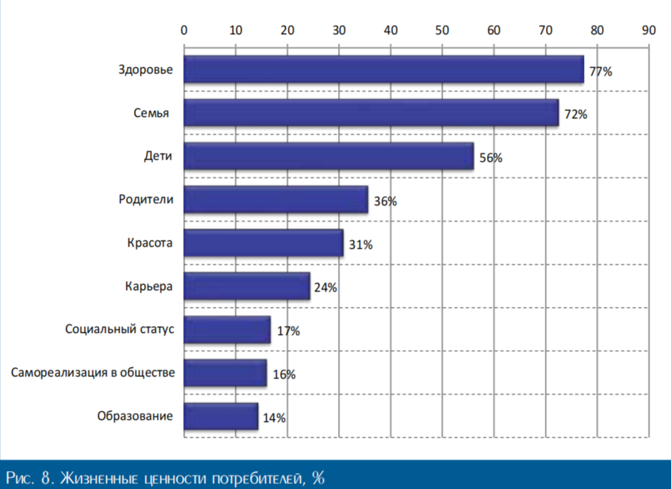 Сейчас все пытаются понять, как же будет развиваться потребительский спрос на молочные изделия в будущем, сохранятся ли текущие тенденции. Для того чтобы ответить на этот и многие другие вопросы, важно не просто понять, как выбирает молоко потребитель, но и что для него вообще важно в жизни и как молочные продукты встраиваются в систему ценностей современного потребителя. Для 77 % потребителей молока наиболее важной жизненной ценностью является здоровье (рис. 8). То есть все потребительское поведение строится на основании постулата «здоровье дороже всего». И действительно, когда мы глубже начинаем понимать потребителя, то находим ответ на вопрос, почему снижается потребление многих продуктовых категорий. Большинство производителей не стремится в своем позиционировании и в своей миссии к тому, чтобы поддержать здоровье нации в целом и поддержать здоровье каждого отдельного потребителя. Реакция потребителя не заставляет себя долго ждать: он голосует рублем против этих изделий. Но производители молока нащупали «золотую жилу» и стремятся поддержать здоровье нации за счет своей продукции.