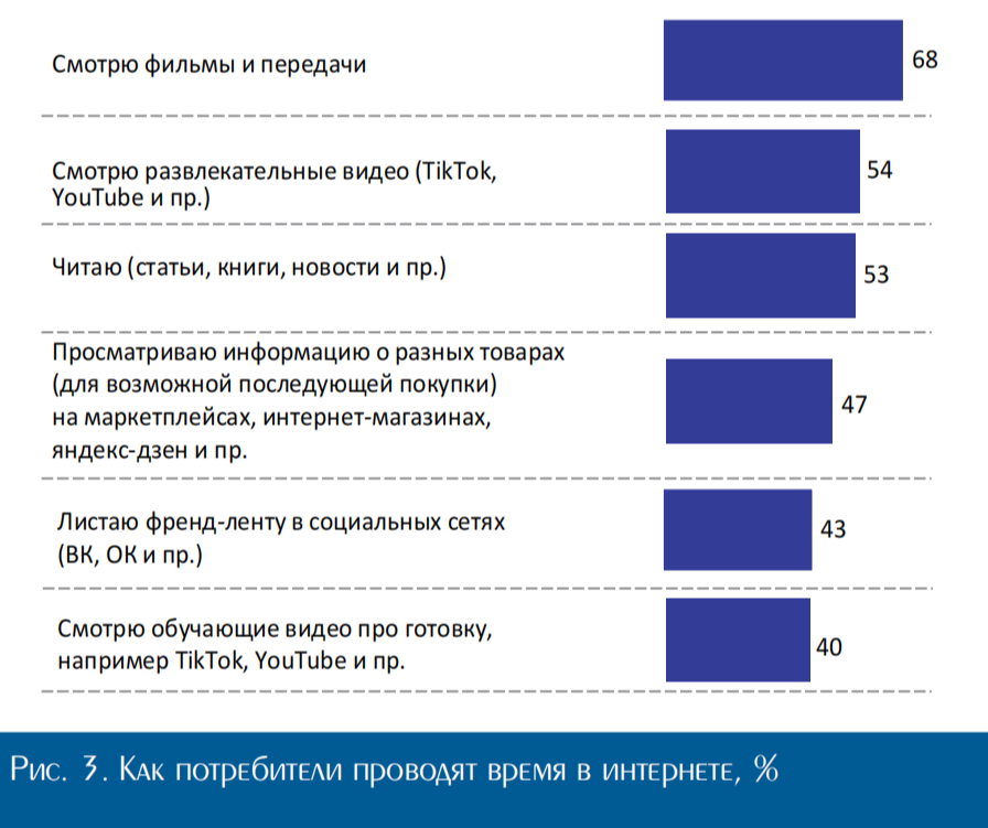 Наиболее часто потребители молока в интернете смотрят фильмы и передачи (68 %) (рис. 3). Можно отметить, что наиболее активны при этом представители целевой аудитории в возрасте от 30 до 39 лет. 54 % аудитории смотрят развлекательные видео. В наибольшей степени это характерно для аудитории в возрасте до 29 лет. Еще 53 % потребителей в интернете читают статьи, книги, короткие новости. Самые активные в этом направлении – представители целевой аудитории в возрасте старше 50 лет. Важно обратить внимание на тот факт, что 47 % потребителей в интернете регулярно просматривают информацию о разных товарах (для возможной последующей покупки) на маркетплейсах, интернет-магазинах, Яндекс-дзен и пр. Это наиболее характерно для аудитории в возрасте от 30 до 39 лет. Также интересно отметить, что потребителей в возрасте до 29 лет активнее, чем потребители других возрастных сегментов, листают в интернете френд-ленту в социальных сетях и смотрят обучающие видео про готовку.