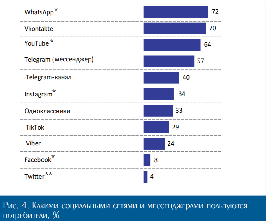 Наиболее активно потребители молока пользуются такими социальными сетями и мессенджерами, как WhatsApp* (72 %), VKontakte (70 %), YouTube (64 %), Telegram (мессенджер) (57 %) (рис. 4). Можно отметить, что мессенджер WhatsApp* и социальную сеть VKontakte наиболее активно используют потребители в возрасте от 30 до 50 лет. В то же время, видеохостинг YouTube и мессенджер Telegram наиболее активно используют потребители в возрасте до 30 лет.