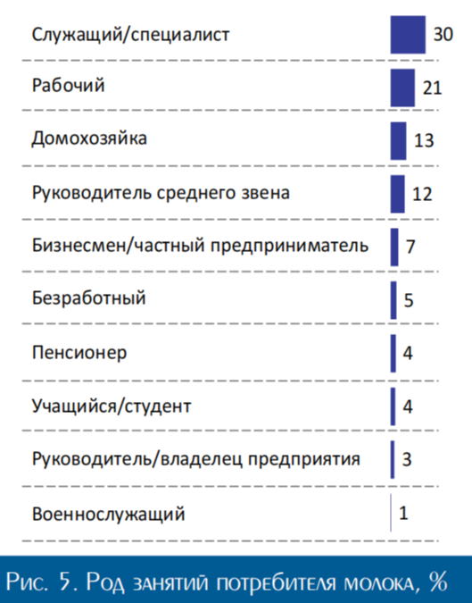 Среди активных потребителей молока наибольшую часть сегмента составляют служащие/специалисты (30 %), рабочие (21 %) и домохозяйки (13 %) (рис. 5). Таким образом, молоко подтверждает статус социального продукта, который покупают все категории потребителей.