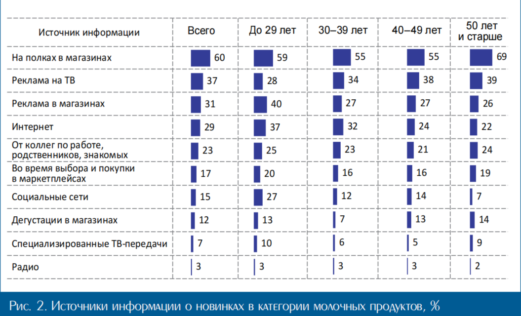 Потребление любого напитка начинается с его выбора. Где и каким образом потребители знакомятся с брендами? Наиболее активно о новых марках и новых продуктах, появляющихся в категории молочных продуктов, потребители узнают непосредственно в магазине, когда подходят к молочной полке (60 %) (рис. 2). Такое потребительское поведение наиболее выражено среди аудитории в возрасте старше 50 лет. На втором месте по актуальности донесения информации о новинках является реклама на ТВ (37 %). Степень влияния рекламы на ТВ снижается по мере омоложения целевой аудитории. Таким образом, можно отметить, что реклама на ТВ сохраняет свою актуальность для аудитории в возрасте старше 40 лет. Важно отметить, что аудитория в возрасте до 29 лет склонна переключаться на другие каналы коммуникации и получать информацию в том числе о новинках на молочной полке через интернет и социальные сети. Таким образом, производителям также важно пересмотреть свою коммуникативную активность и уделить большее внимание общению с целевой аудиторией в интернете и социальных сетях.
