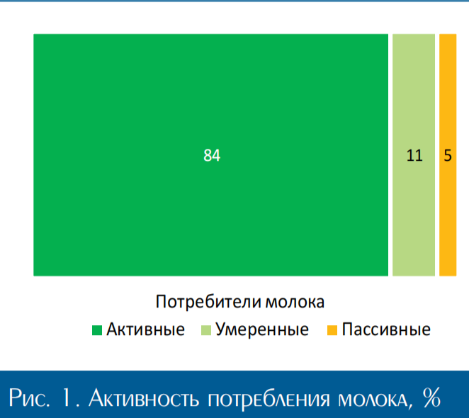 Для начала определимся с размером сегмента «активный потребитель»: 84 % потребителей молока оставляют активную категорию (покупают молоко не реже одного раза в неделю), 11 % – составляют умеренную категорию (покупают молоко 2–3 раза в месяц) и 5 % – составляют пассивную категорию (покупают молоко реже одного раза в месяц) (рис. 1).