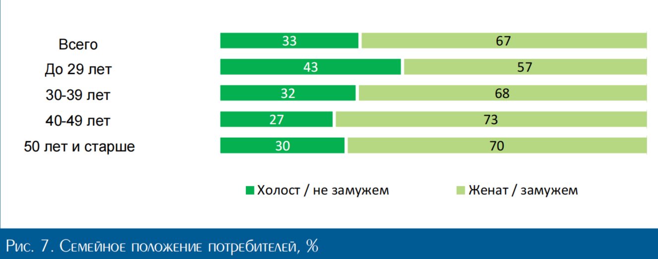 Среди активных потребителей молока 67 % имеют семью (рис. 7). Данные достаточно консистентны и характерны для всех регионов России. В то же время семейное положение коррелирует с возрастом целевой аудитории. Так, среди потребителей в возрастной группе до 29 лет около 43 % не имеют семью.