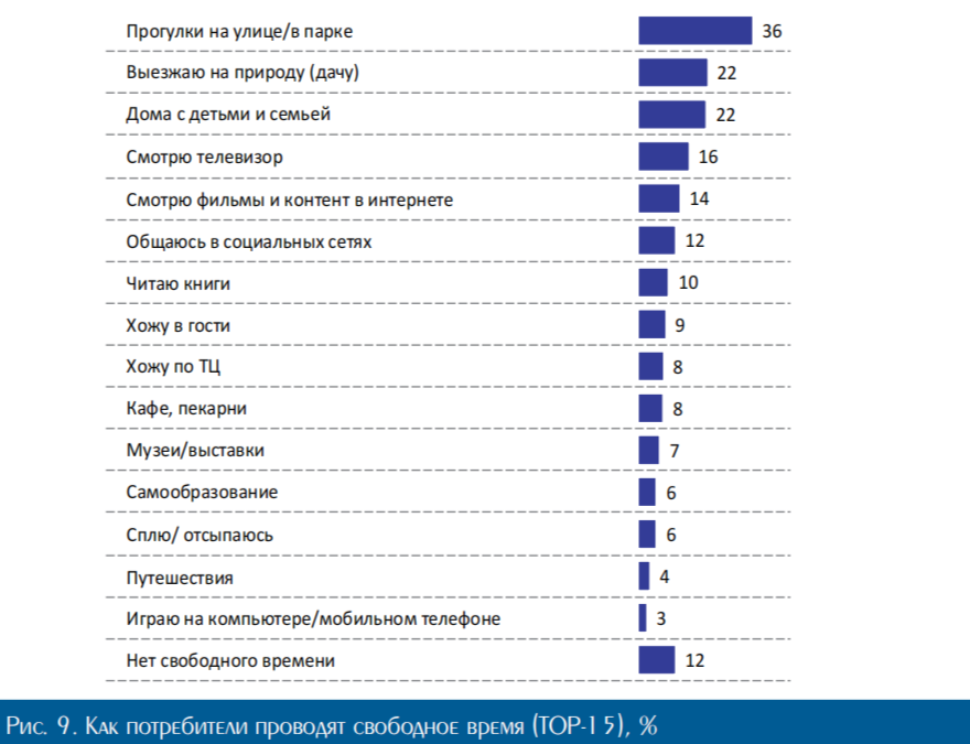 36 % потребителей молока в свободное время совершают прогулки на улице/в парке (рис. 9). Также 22% целевой аудитории активно в свободное время выезжает на дачу или на природу. Таким образом, потребители стремятся поддержать здоровый образ жизни и как можно больше времени проводить на свежем воздухе. Можно отметить, что 22 % потребителей все свободное время стремятся проводить с семьей и детьми. Таким образом, наблюдается прямая корреляция жизненных ценностей и структуры свободного времени потребительской аудитории.