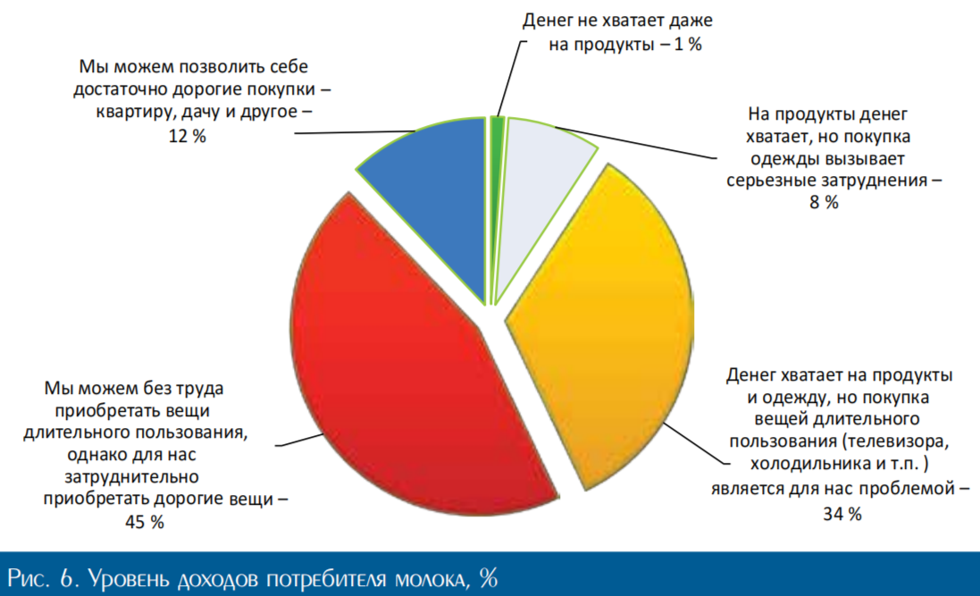 45 % активных потребителей молока могут без труда приобретать вещи длительного пользования, однако для них затруднительно приобретать дорогие вещи (рис. 6). Почему важно знать и понимать эту характеристику портрета потребителя? Это, например, дает представление о том, что ценовой фактор при выборе молока не будет иметь первостепенное значение для данной аудитории. Еще у 34 % потребителей денег хватает на продукты и одежду, но покупка вещей длительного пользования (телевизора, холодильника и т.п.) является для них проблемой. Очевидно, что ценовой фактор будет важен для 8 % аудитории, которым на продукты денег хватает, но для которых покупка одежды вызывает серьезные затруднения, и для 1 % аудитории, кому денег не хватает даже на продукты. В каждом из этих сегментов также можно отметить региональную специфику.