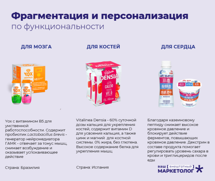 На рынках других стран появляются запуски функциональных продуктов с фокусом на подержание здоровья сердца и сосудов, опорно-двигательного аппарата, стрессоустойчивость, хороший сон. Для нас это скорее «интересная история без продолжения», но общий тренд на здоровье через питание просматривается. Что не исключает в коммуникациях более активного фокуса на те полезные свойства, которые есть априори у молочных и кисломолочных продуктов, исходя из их «природы» и специфики производства.