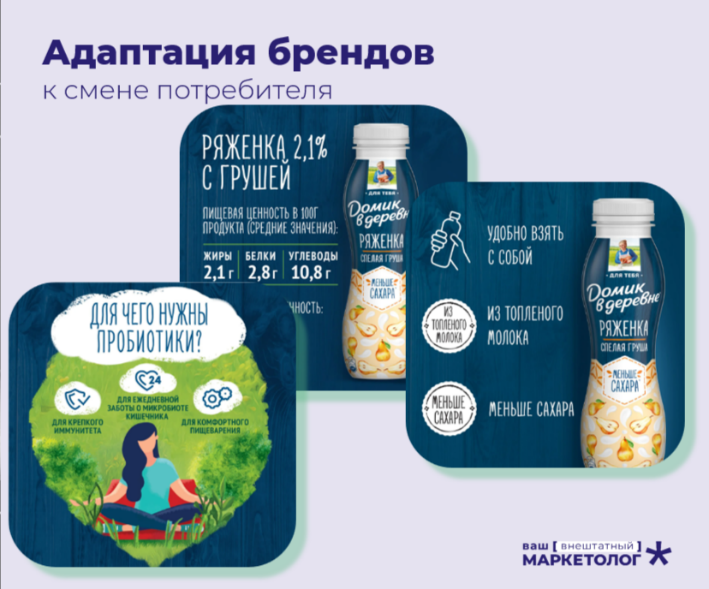 К новым запросам адаптируются и бренды, даже те, которые создавались под «старших» и всегда ассоциировались с традиционным ассортиментом. Меняется формат упаковки (теперь и индивидуальный, а не только большой семейный), меняется органолептика (не такая густая, удобная для потребления из небольшой бутылки «на ходу»), добавляется фруктовый вкус. Позиционирование – под запросы тех, для кого важно содержание сахара и жиров, калорийность, дополнительная функциональность (например, польза для пищеварения за счет пробиотиков).