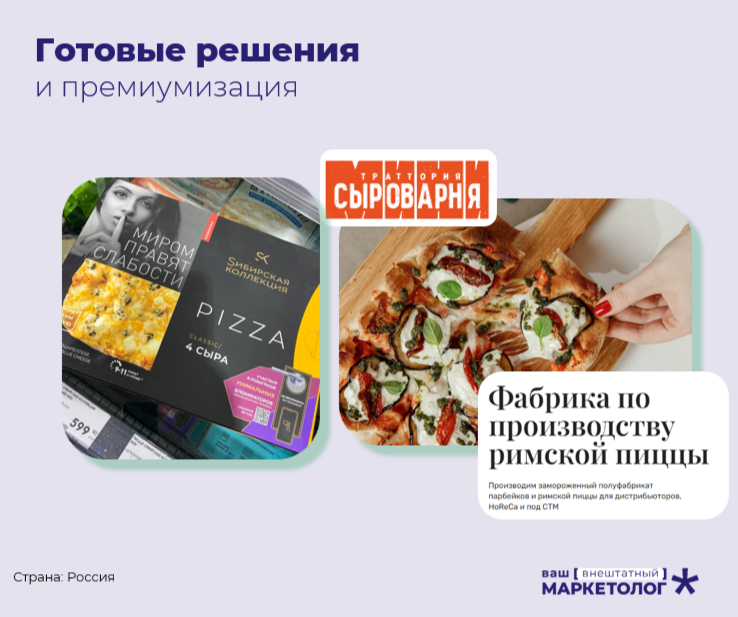 Этот формат организации питания все больше набирает обороты - в 2024 году рост составил 32%. Причем активнее всего развитие идет на Дальнем Востоке. Причина роста в России – изменения ритма жизни, сокращение размера домохозяйств, экономическая доступность и достойное качество. В игру вступил ресторанный бизнес, который предлагает розничным сетям замороженный формат римской пиццы под СТМ, что говорит о развитии сегмента Средний+ и Премиум и актуальности ингредиентных решений более высокого качества.