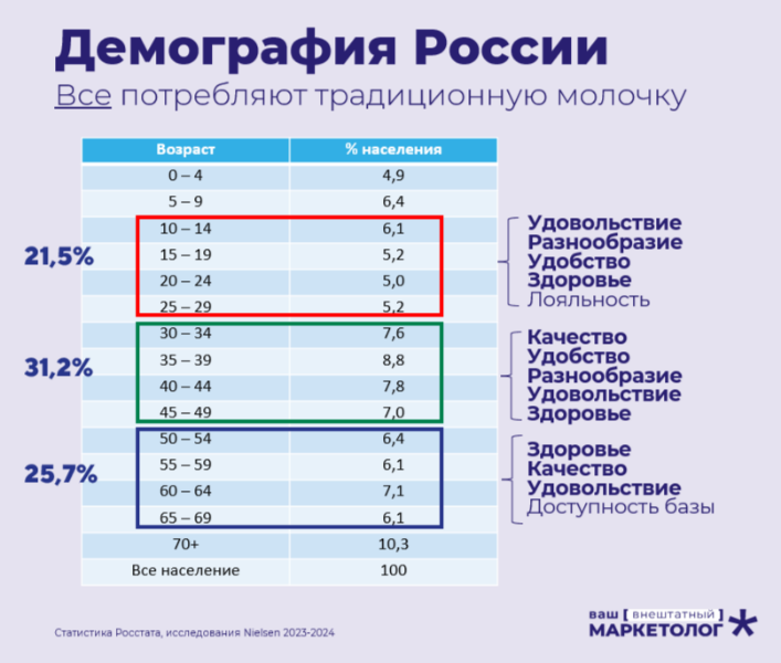 Значительным драйвером сразу нескольких трендов в питании является демография. Посмотрим на демографическую картину России по возрастным группам и их запросам в питании. Как видим, наиболее привлекательными для бизнеса являются «средние» поколения в возрасте от 30 до 50 лет - по доходам, открытости для решений с добавленной стоимостью, вниманию к качеству питания для себя и детей.