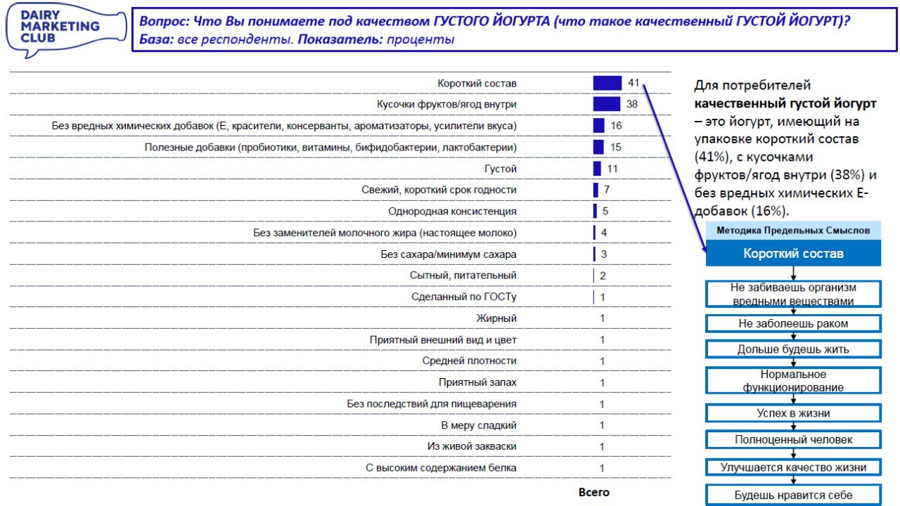 Для потребителей качественный густой йогурт – это йогурт, имеющий на упаковке короткий состав (41%), с кусочками фруктов/ягод внутри (38%) и без вредных химических Е-добавок (16%).