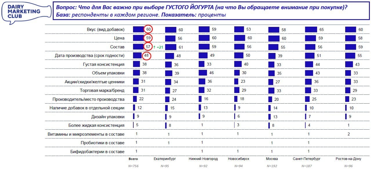 Потребители всех регионов прежде всего обращают внимание на такие характеристики при выборе густого йогурта как вкус (60%), цена (59%), состав (57%), дата производства (48%).