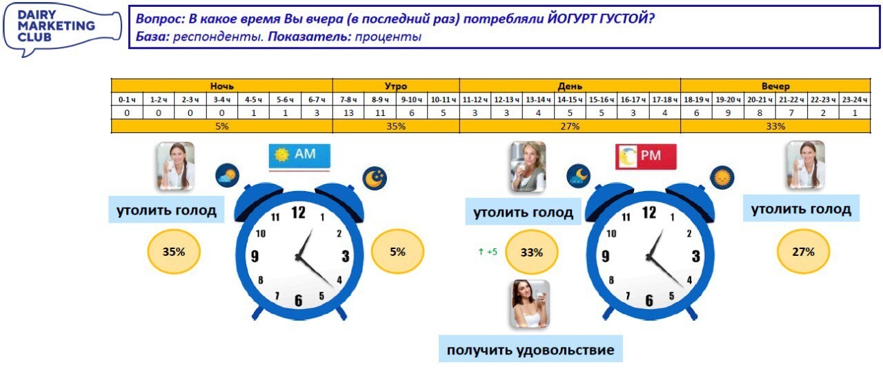 Наибольшая активность потребления густого йогурта приходится на утренние часы (35%) и вечерние часы (33%).