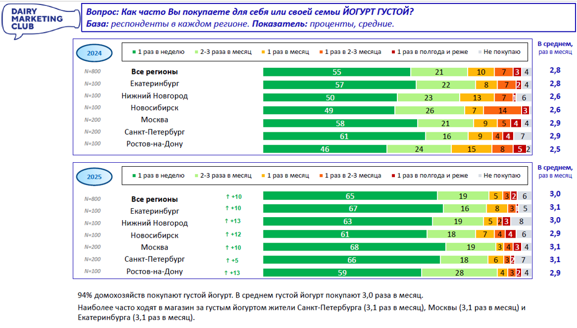 94% домохозяйств покупают густой йогурт. В среднем густой йогурт покупают 3,0 раза в месяц. Наиболее часто ходят в магазин за густым йогуртом жители Санкт-Петербурга (3,1 раз в месяц), Москвы (3,1 раз в месяц) и Екатеринбурга (3,1 раз в месяц).