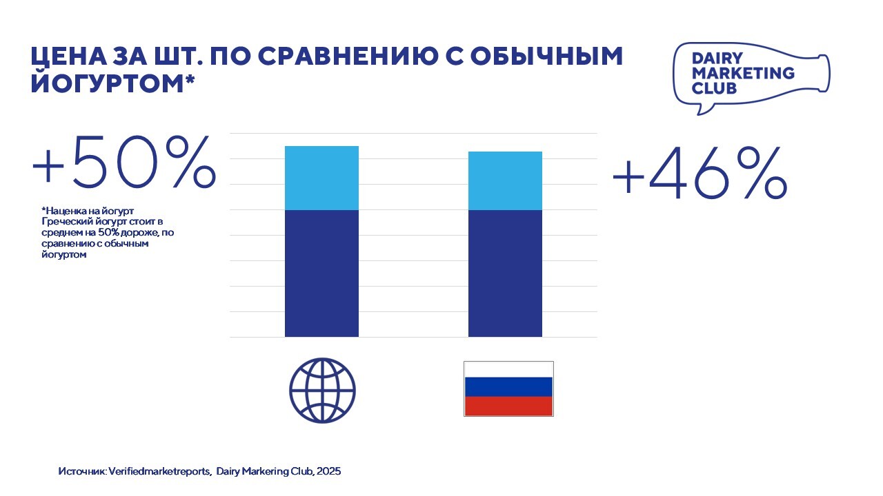 Греческий йогурт по сравнению с обычным йогуртом стоит в среднем на 50% дороже зарубежом, и на 46% дороже в России.