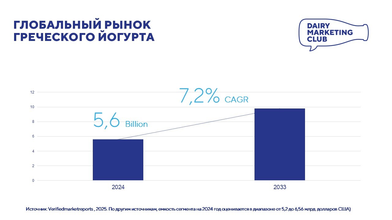 По данным Verifiedmarketreports объем мирового рынка греческого йогурта по итогам 2024 года оценивается в 5,6 млрд.долларов США с прогнозными среднегодовыми темпами роста до 2033 г. в 7,2%.