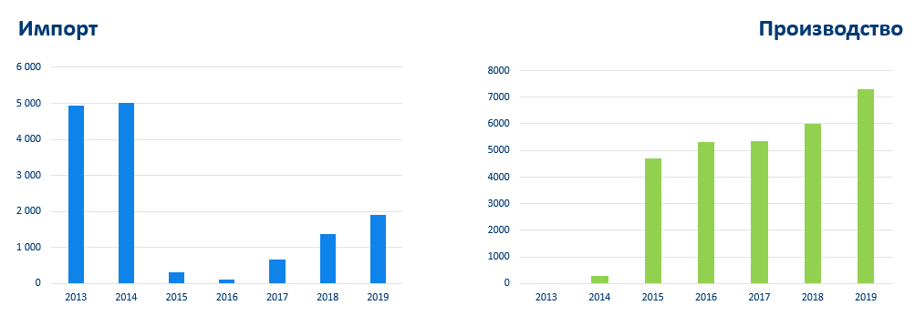 Динамика импорта и внутреннего производства безлактозного молока в России (данные Федеральной таможенной службы, International Trade Center Евразийской Экономической комиссии)